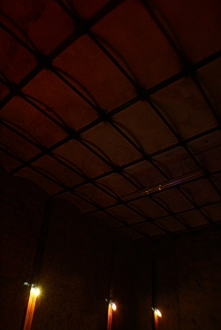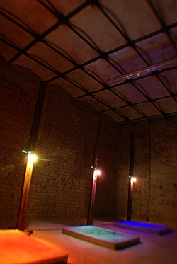 e n g l i s h The RRRGGGBBB-TOMB is an extensive installation made with methods and objects found at the textile museum. Spots have been fixed to textile-tension-beams. Thus the room turns into a halfshadowed tomb whereas the basic colors of the electrical image generate a floating mixture. From the floor 3 hollow aluminum blocks spread the pale illumination into the darkest corners of the space. The initial window-element turned into a blind mirror. also This mirror simply relegates back into the room. The room reminds a black box. The back-stage of a magic theatre where manufactory's, industries and digital illusions have come to an end. They culminate to some kind of explosive matter made from the indescribable époque we live in.